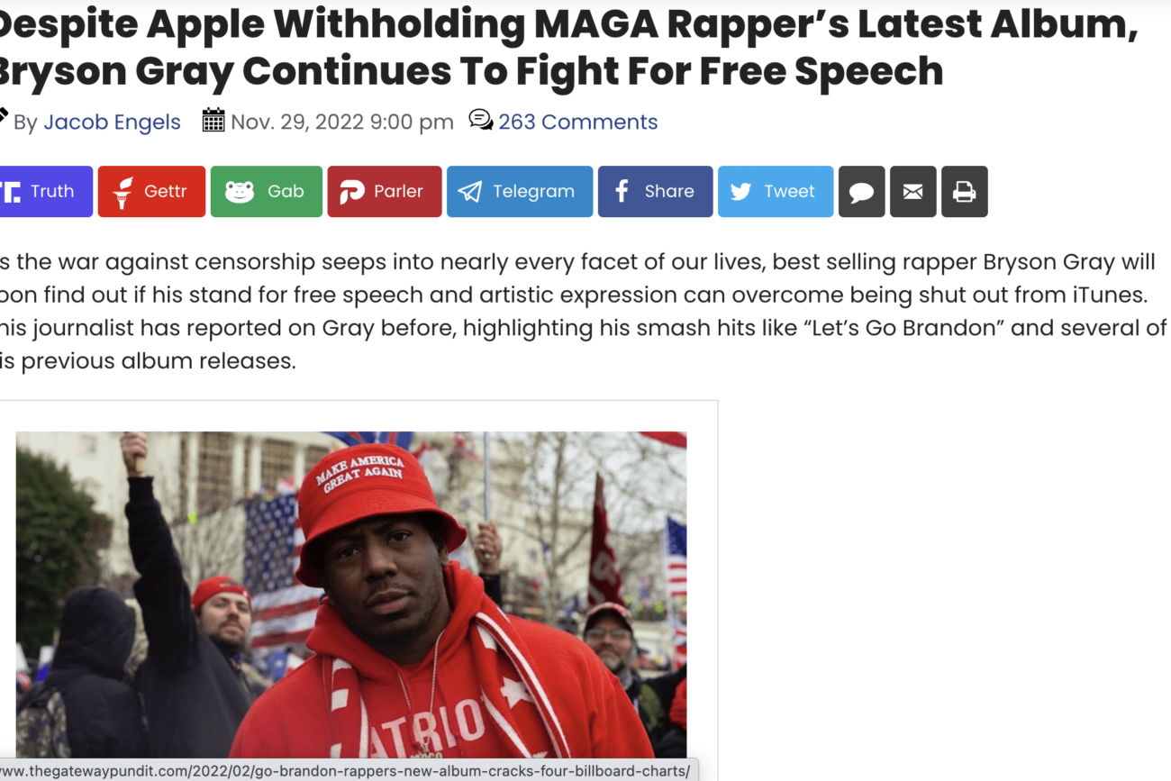 Republican rapper Bryson Gray drew attention for rapping almost exclusively about his allegiance to Donald Trump and his right-wing political views. In addition to a loud and active social media presence, Gray prolifically released music centered around his politics, gaining some traction with his 2020 release Maga Ain’t Got No Color and its featured track “Trump Is Your President.” “Let’s Go Brandon,” an anti-Joe Biden cut, arrived the following year.